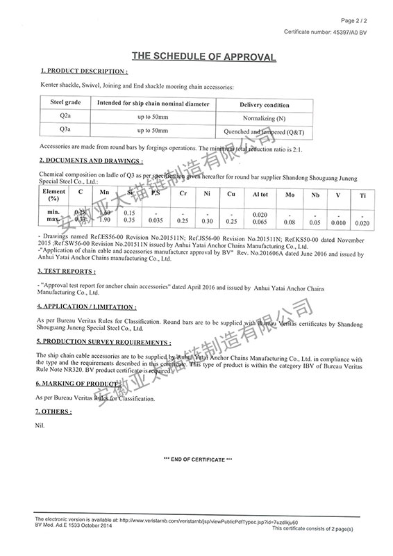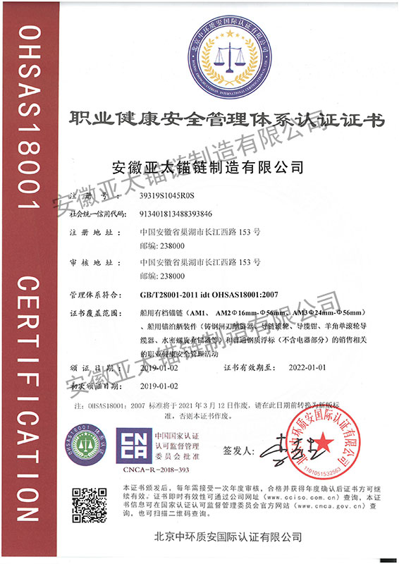 安徽亞太錨鏈制造有限公司是國家高新技術企業(yè),也是國家GB/T 549-2017《電焊錨鏈》標準的起草和制定單位之一。公司旗下設有錨鏈分廠、浮標分廠、舾裝件分廠等多個分廠。公司專業(yè)從事φ12.5mm-φ107mm二、三級船用錨鏈、浮標錨鏈、錨鏈附件,錨、船舶曬裝產品、航標、系船浮、船型標、多種規(guī)格海洋監(jiān)測浮標及航標燈等產品的生產、安裝和服務。目前公司的產品銷往全國各地船廠、碼頭、航標處、航道局、海洋局,并已走上國際市場,如東南亞、中東、歐美等國家。